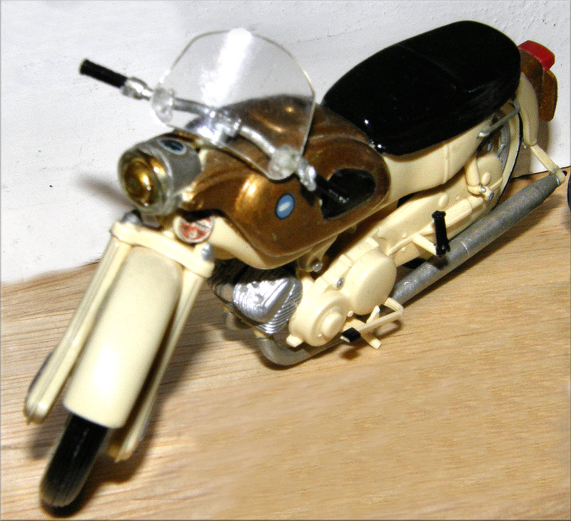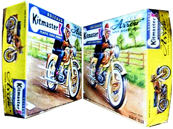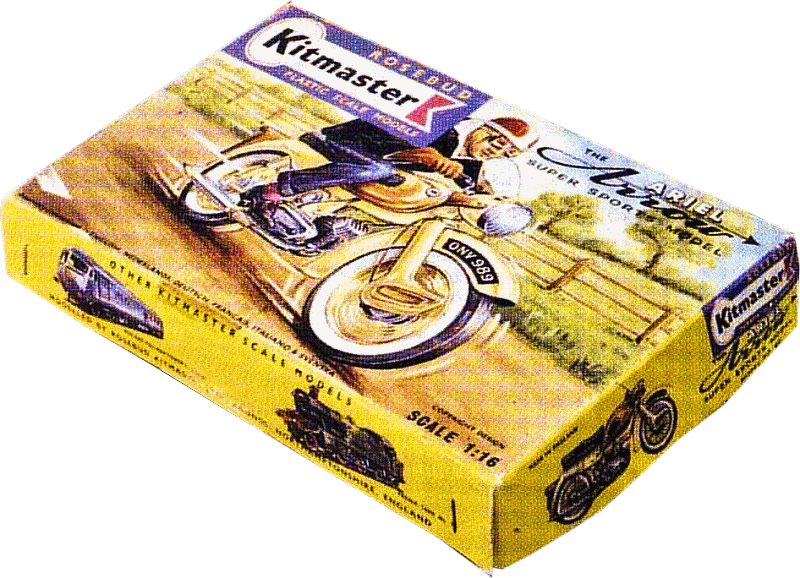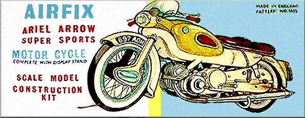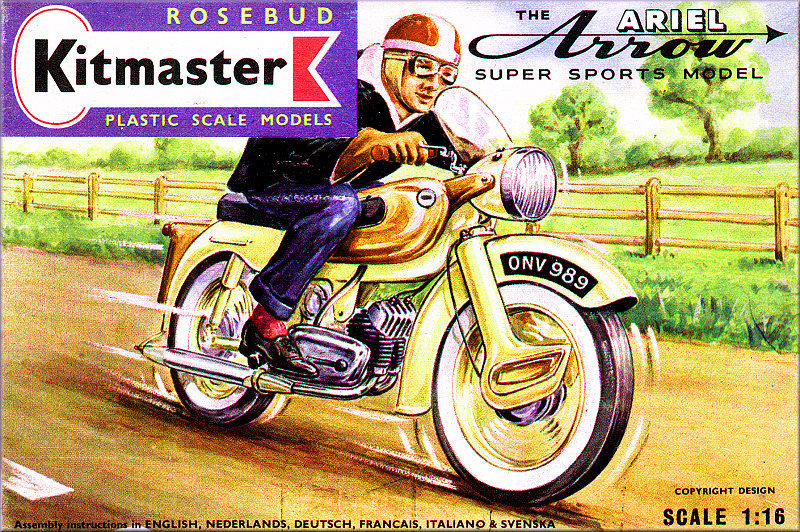 This model was the first of what was to be a series of motor bike kits. It was the first non railway locomotive item made by Kitmaster. In 1962 the parent company, Rosebud, sold off the Kitmaster range to Airfix and the Ariel Arrow was the first Kitmaster kit to be released by them.